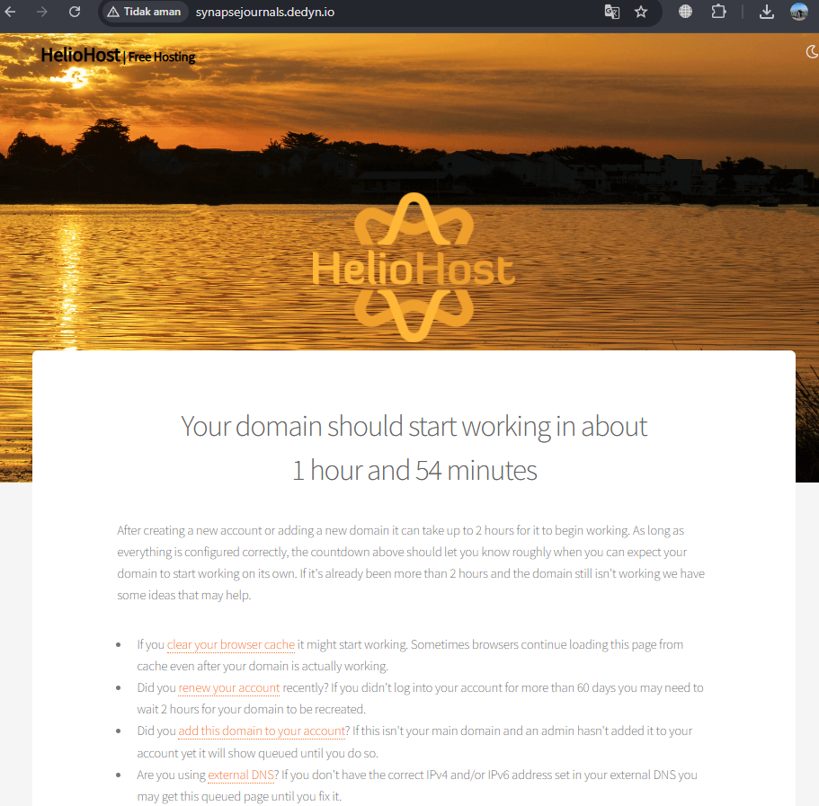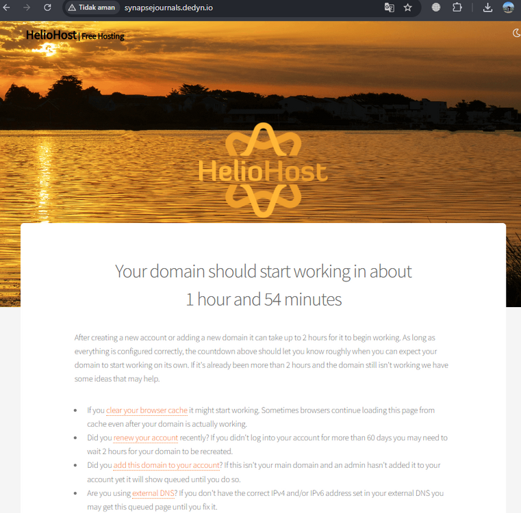 Subject: Please add alias domain synapsejournals.dedyn.io Hi HelioHost support, Please add a parked / alias domain to my account. Username: khamdanaf Server: Tommy Main domain: journalpulse.heliohost.us Alias domain: synapsejournals.dedyn.io DNS for synapsejournals.dedyn.io already points to: A 65.19.154.90 AAAA 2001:470:1:1ee::1002 Please park this alias to my main domain journalpulse.heliohost.us (httpdocs). Thank you.