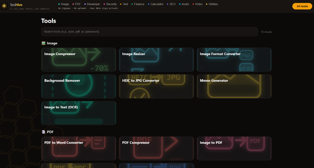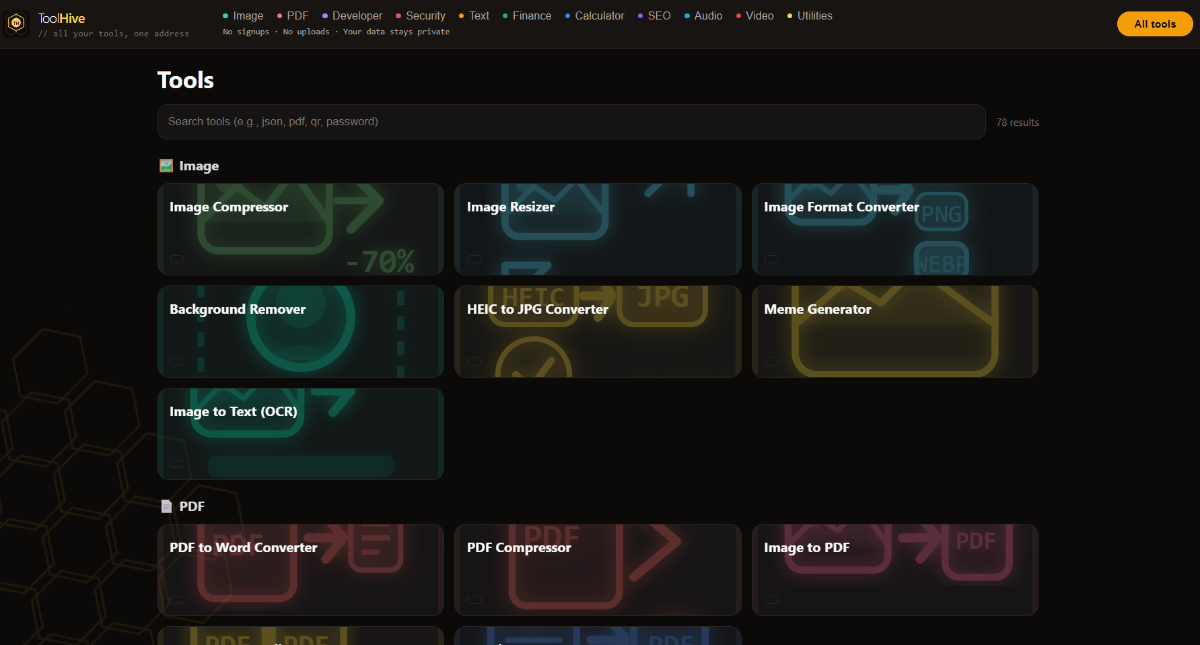 2. https://toolhive-poppabuzz.vercel.app/ *Full disclosure - I vibe coded this* There are 78 tools in this one page. All free. No signups. All done client-side so your data is safe. If you so decide, please test. Please let me know what works, what doesn't work. What tools do you actually use, and what tools would you use? I added the HelioHost's partner link for Namescheap in the footer. If that is not ok, please let me know and I will remove it.